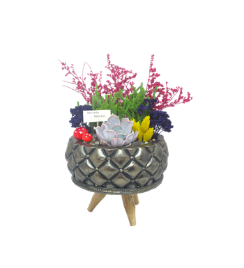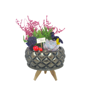 Ayaklı cam saksı içerisinde, ficus bonsai, maket malzemeleri, kuru bitkiler, yapay bitkiler kullanılarak tasarlanmıştır. Ürün bakım bilgileri siparişinizle birlikte gönderilecektir.