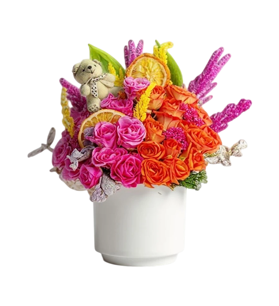 Romantik bir jest yapmak ve sevdiklerinizin yüzünü güldürmek mi istiyorsunuz? Beyaz saksı içerisinde zarifçe düzenlenmiş Beyaz Saksıda Ayıcıklı Pembe ve Turuncu Güller ile sevginizi en güzel şekilde ifade edebilirsiniz. Bu özenle hazırlanmış çiçek tasarımı, özel günlerinizde veya sıradan bir günü unutulmaz kılmak için ideal.