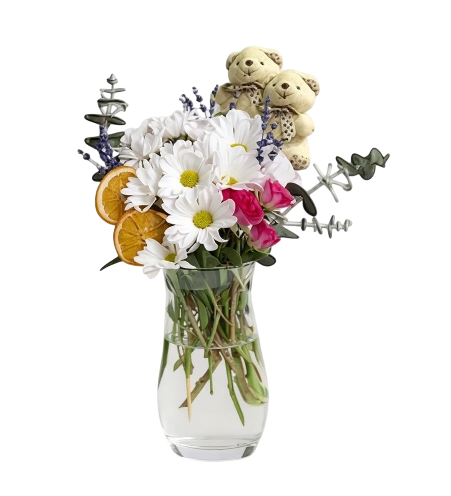 Romantik bir jest yapmak ve sevdiklerinizin yüzünü güldürmek mi istiyorsunuz? Silindir cam vazo içerisinde zarifçe düzenlenmiş Cam Vazoda Ayıcıklı Papatya ve Pembe Çardak ile sevginizi en güzel şekilde ifade edebilirsiniz. Bu özenle hazırlanmış çiçek tasarımı, özel günlerinizde veya sıradan bir günü unutulmaz kılmak için ideal.