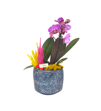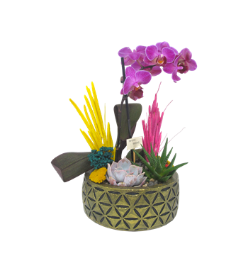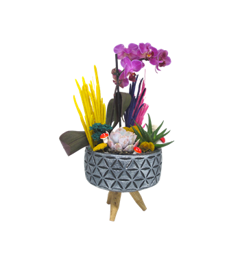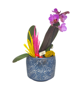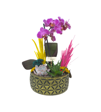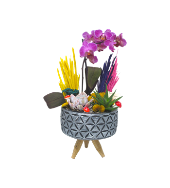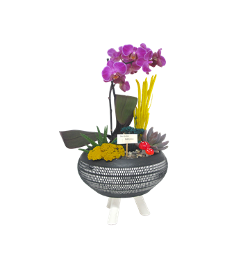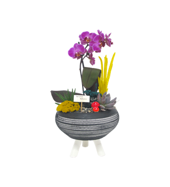 Taş saksıda orkide tasarımıdır. Mini orkide, senecio türü sukulent, kuru ve şoklanmış bitkiler, kişiselleştirme için tabela kullanılmıştır. Son derece şık ve dekoratif bir üründür. Doğru bakım ile uzun yıllar size ve sevdiklerinize eşlik edecek bir hediyedir.
