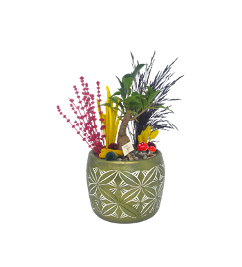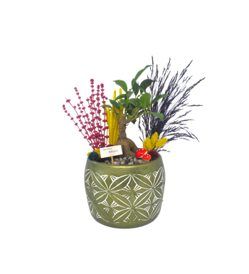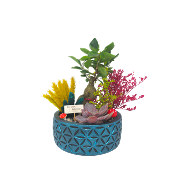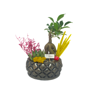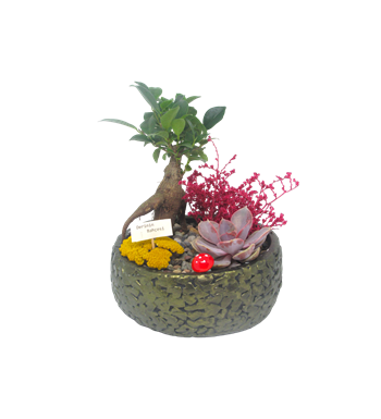 Dekoratif saksıda, ficus ginseng bonsai, şoklanmış cipso, tabela, ve yosun kullanılarak size özel tasarlanmıştır. Doğru bakım ile size uzun yıllar eşlik edecek bir tasarımdır. Ürün boyutu; Saksı çapı 13cm, bitki dahil yükseklik 30 cm'dir.