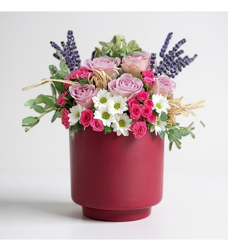 Romantik bir jest yapmak ve sevdiklerinizin yüzünü güldürmek mi istiyorsunuz? Beyaz saksı içerisinde zarifçe düzenlenmiş Mürdüm Saksıda Pembe Çardak ve Lila Güller ile sevginizi en güzel şekilde ifade edebilirsiniz. Bu özenle hazırlanmış çiçek tasarımı, özel günlerinizde veya sıradan bir günü unutulmaz kılmak için ideal.
