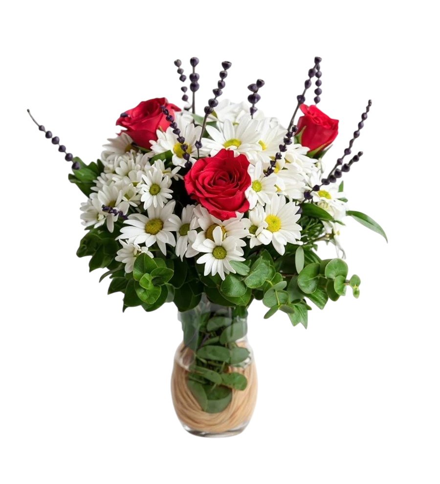 Romantik bir jest yapmak ve sevdiklerinizin yüzünü güldürmek mi istiyorsunuz? Silindir cam vazo içerisinde zarifçe düzenlenmiş Papatya ve Kırmızı Güller ile sevginizi en güzel şekilde ifade edebilirsiniz. Bu özenle hazırlanmış çiçek tasarımı, özel günlerinizde veya sıradan bir günü unutulmaz kılmak için ideal.