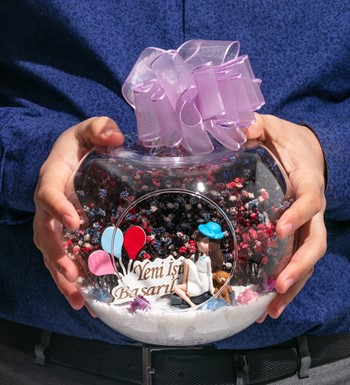 Küçük boy elma cam fanus içerisinde tasarladığımız bu kurdeleli güzel teraryum; beyaz kum, karışık renkli kurutulmuş bitkiler, renkli yapay mini güller, bir adet ahşap yeni işinde başarılar yazılı balonlu tabela ve bir adet sarışın genç kadını simgeleyen objeler kullanılarak tamamlanmıştır. Ev ve ofis ortamlarının tamamında sergilenebilir teraryumun içinde, kurutulmuş bitkiler bulunduğundan hava alması önemlidir. Açık olan kısmının kapatılmaması veya büfe vb. kapalı alanlara konulmaması gereklidir. Özellikle her ortamda yıllarca, zevkle izlenebilecek özel bir teraryumdur. Yaklaşık Ölçüleri: 20x20cm NOT: Teraryumlarda kullanılan camlar, üfleme cam işçiliğiyle üretildiğinden bazı detaylarda farklılıklar gözlenebilir. Örneğin, sap kısmı ve ağız bitiş noktalarının her biri kendine özgüdür.