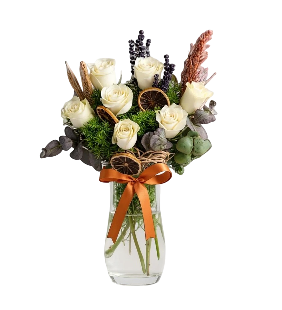 Romantik bir jest yapmak ve sevdiklerinizin yüzünü güldürmek mi istiyorsunuz? Silindir cam vazo içerisinde zarifçe düzenlenmiş White Roses in a Design Vase ile sevginizi en güzel şekilde ifade edebilirsiniz. Bu özenle hazırlanmış çiçek tasarımı, özel günlerinizde veya sıradan bir günü unutulmaz kılmak için ideal.